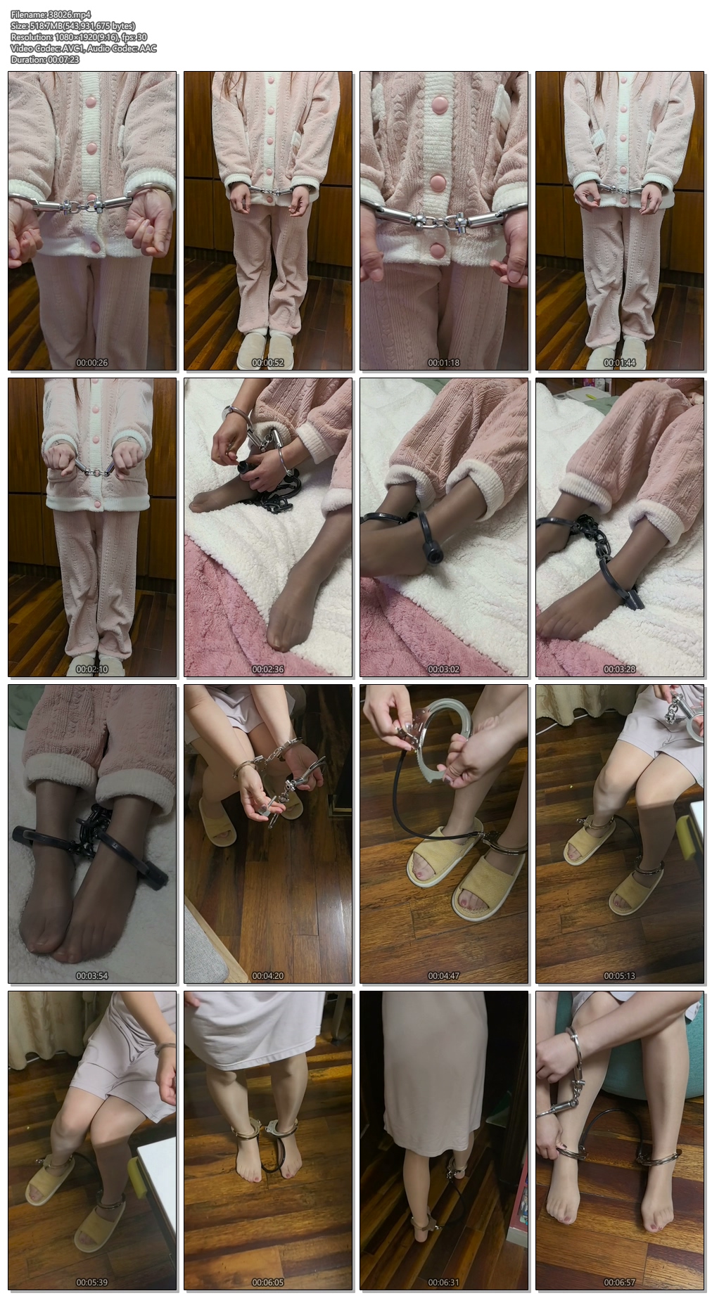 穿着粉色家居服,灰色丝袜,亲手给自己戴上了手铐,并且向大家展示手铐,听着咔咔的手铐声,真是赏心悦目,到床上又戴上了脚镣,很是开心