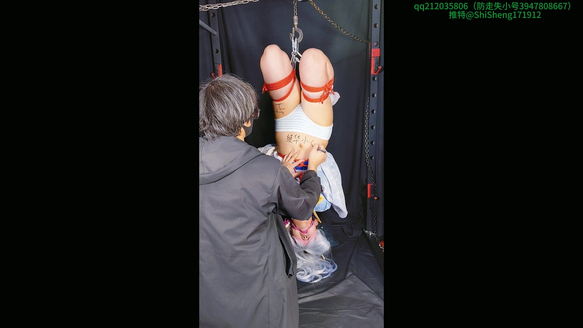 《场景二》,昏迷过去的绫华小姐,坏人也并没有闲着,绑好折腿缚之后,还在昏迷着的绫华感觉自己的身体似乎正在慢慢上升的状态,这种失重的感觉让绫华瞬间慌了起来,但是由于眼罩的关系,并不能够看到任何的事物,只能够感受到自己的身体被缓缓的抬升,无助的挣扎着,大脑在下的缘故,能够清晰的感知到身体上的每一处感觉,当然也包括,双腿之间的位置,于是倒吊在空中的绫华小姐,一次又一次的清晰的感受着自己的高超,娇喘的声音一声声的发出,甚至中途换了更大的玩具塞入,明明是战败,明明已经在用力抵抗了…..在[X_X]的作用下,绫华小姐开始慢慢的享受这种折磨,直到舒服的意识都不清醒了,身体上被写下的屈辱文字显示着少女悲惨的经历
