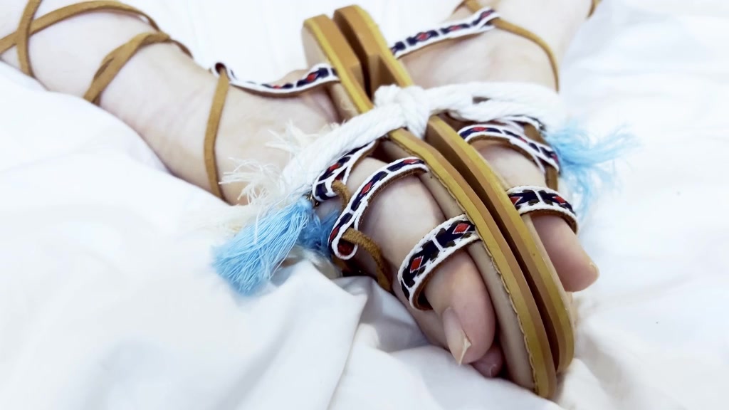 把可心束缚解开,让可心穿上杏色凉鞋然后把穿凉鞋的双脚,脚底对脚底用绳子绑在一起让可心双脚没法分开,把玩可心的脚再用牙签戳可心的脚合种部位,可以稍微用点力戳