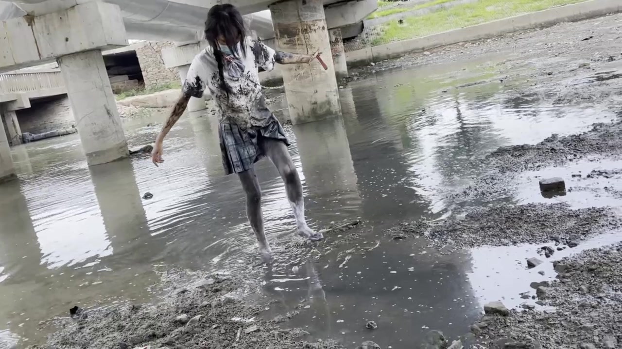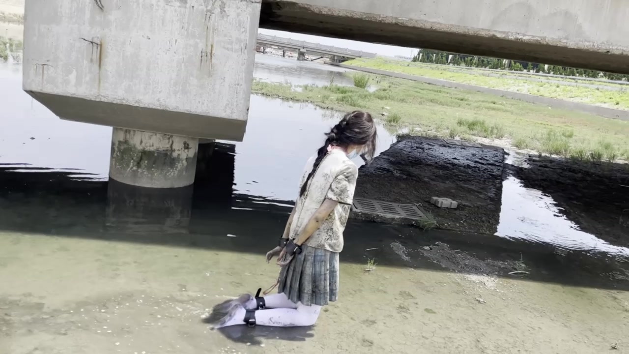 地点选在一个排水渠 水很脏都是污水 妹子毫无畏惧 第一次尝试sm风格 。