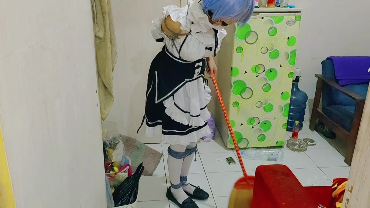 【TiedIndonesia】cos特辑,女仆rem被绑住被迫打扫屋子,雇主将手脚绑在一起用球捂住嘴