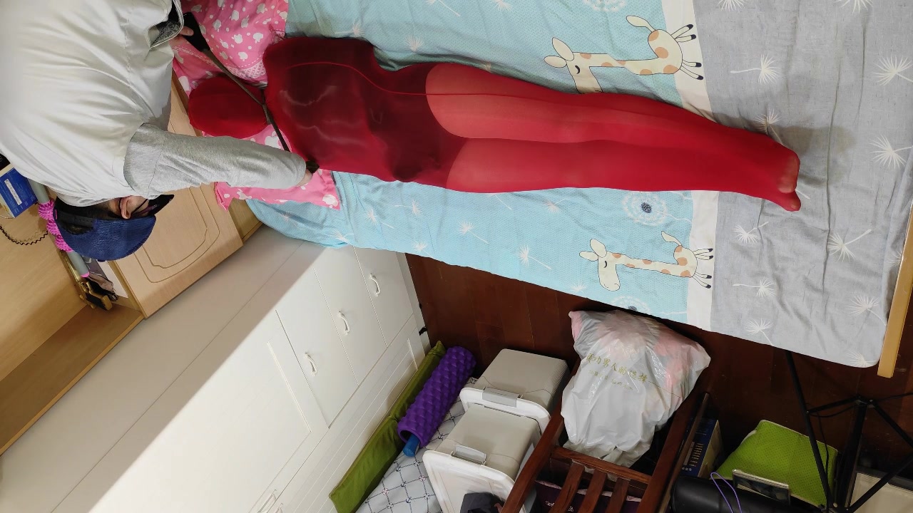 定拍的妹子第一次玩Zentai小白鞋装进红色丝袜袋中 ,双层裤袜配 Zentai,体操瑜伽动作 展示身体线条,穿上小白鞋,最后被装进红色丝袜睡袋中。