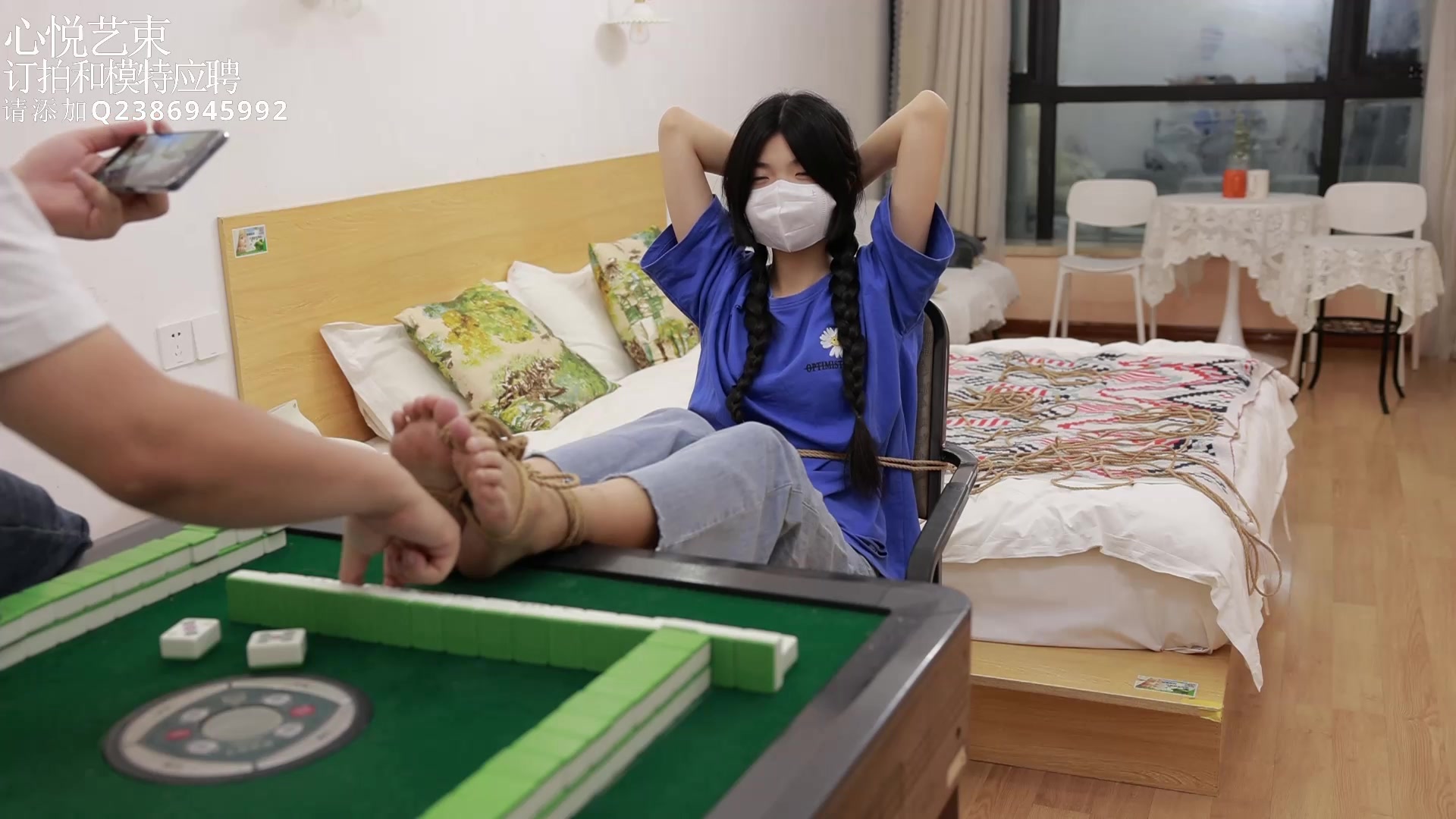 【心悦艺束】超可爱得00后妹子UU试镜最终章,双手脑后缚,脚掌脚趾全绑麻将TK,试镜得地方刚好有一个麻将桌,干脆就让UU体验体验不同麻将花色摩擦脚底都是什么感受。